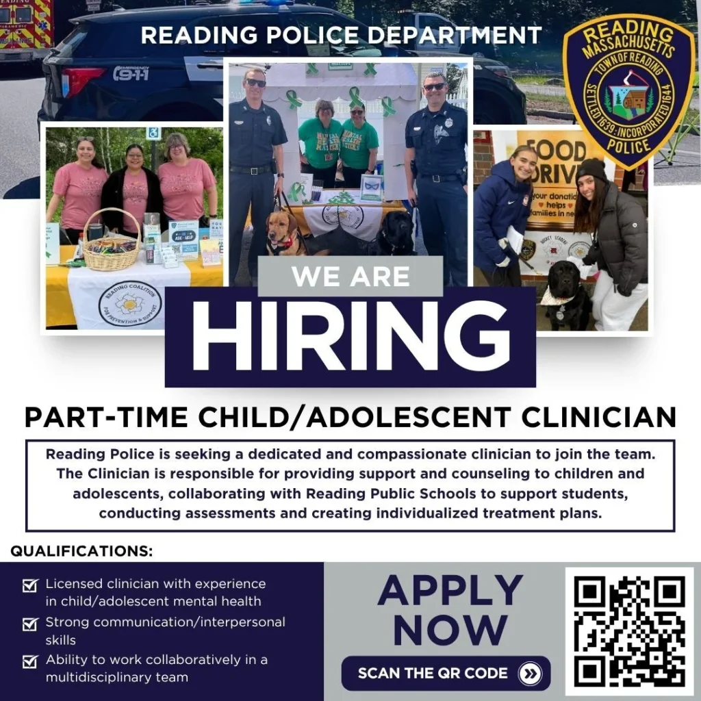 Recapping Everything in Reading, MA > News > 🏛️Town Gov't > 🚨Police & Fire > 📢 Reading Police Department Hiring Part-Time Child/Adolescent Clinician