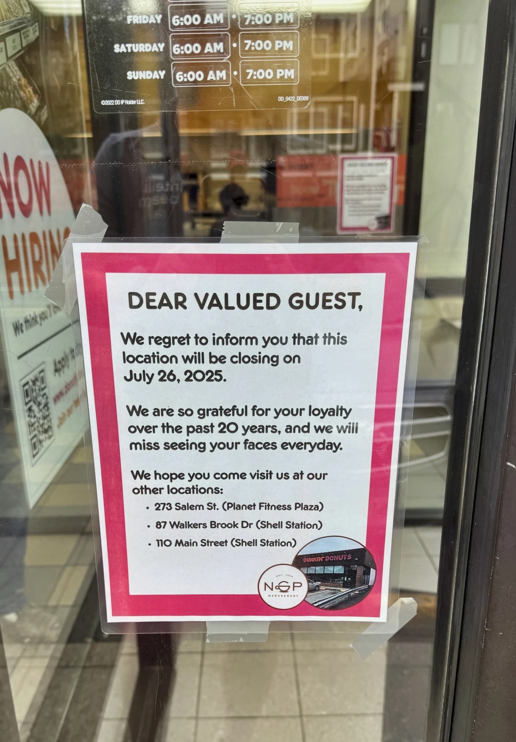 Attached is the notice displayed on the door by NGP Management, which oversees 100 Dunkin’ locations throughout New England.