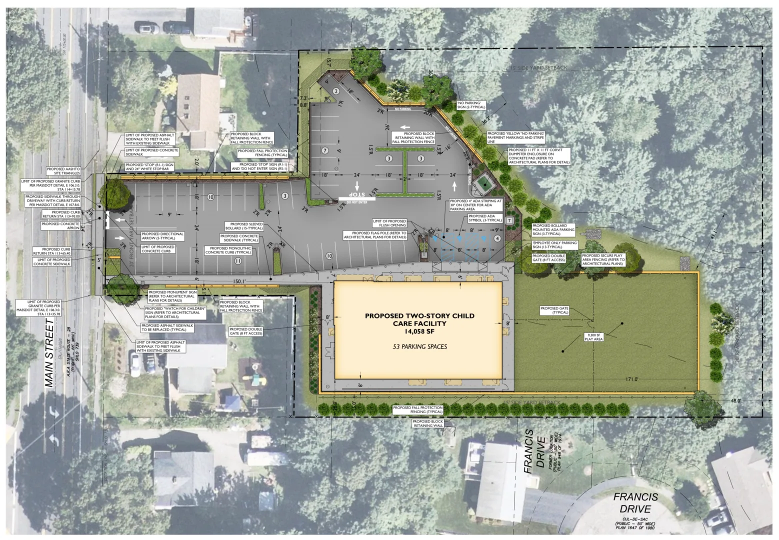 A proposed Primrose School at 885 Main Street has sparked significant debate among residents and town officials, as the Community Planning and Development Commission (CPDC) continues its review of the site plan. The project, which would convert a residential property into a full-scale childcare facility serving up to 175 children, has raised concerns about traffic safety, emergency access, and neighborhood impact.