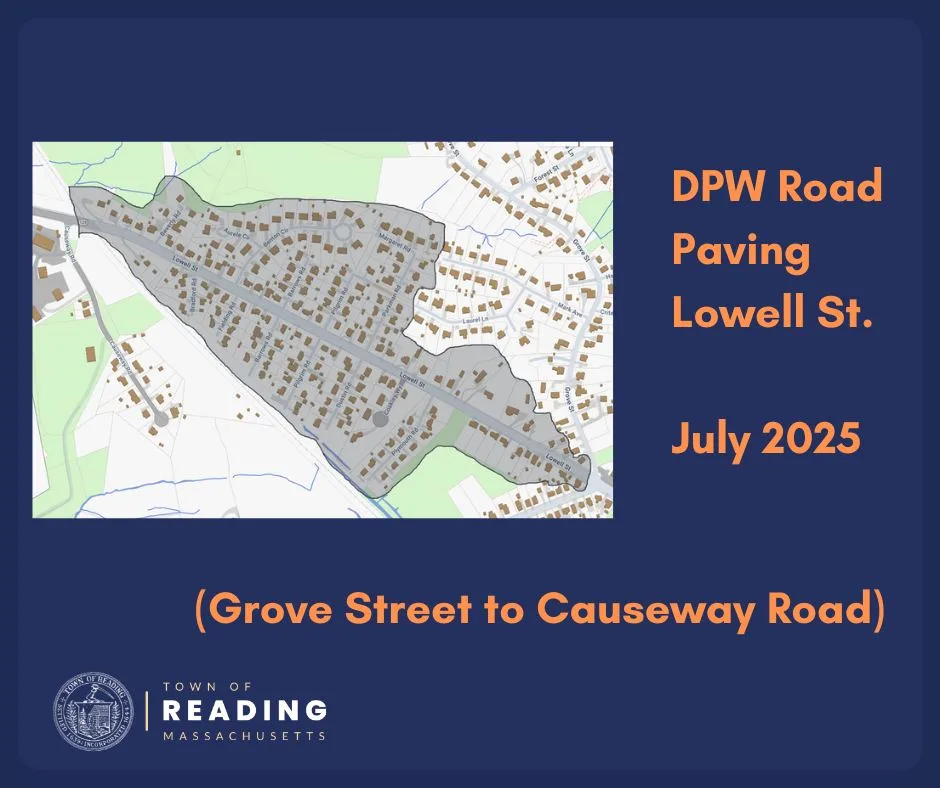 Please be advised that beginning tonight, Tuesday July 22nd at 8:00 P.M., weather permitting, the Townโs paving contractor, Cassidy Corp. will be paving a segment of Lowell Street/Route 129 between Grove Street and Causeway Road. The paving night schedule is 8:00 P.M. to 5:00 A.M. Delays, detours, and road closures should be expected. Please be prepared for potential delays as construction is occurring. All on-street parking will be prohibited and will be strictly enforced by the Reading Police Department.
