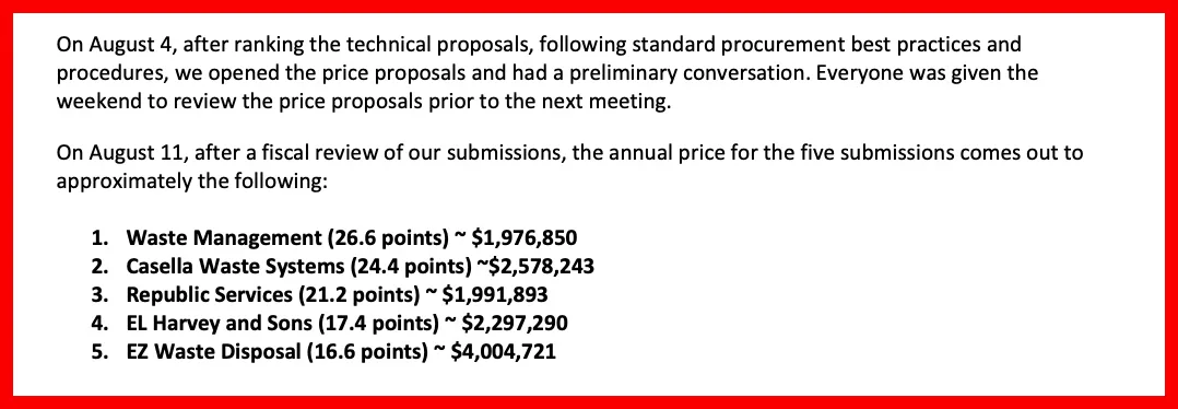 The contract includes a 5% annual escalation, meaning costs will rise incrementally each year. Despite the increase, Waste Management’s proposal was the lowest among the five vendors who submitted bids, and it scored highest in technical evaluations.