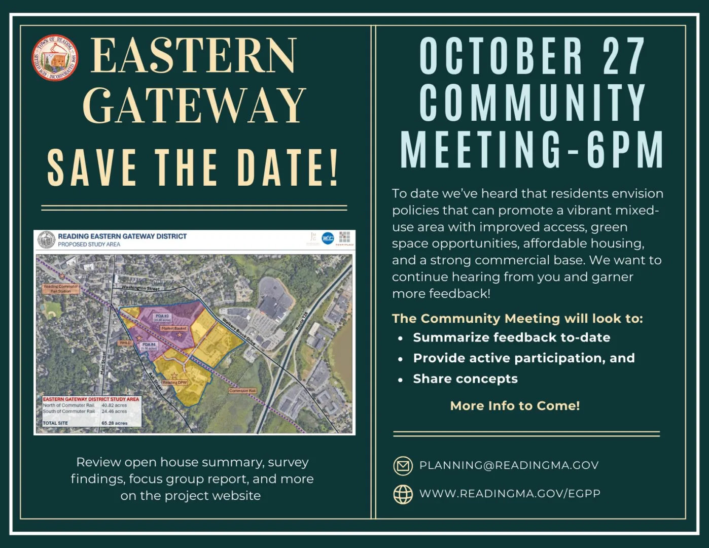 The Town is hosting a Community Meeting at the Reading Public Library on Monday October 27 at 6:00 pm to share the findings and community feedback on the Eastern Gateway โ an area along Walkers Brook Drive under consideration for new zoning and growth opportunities. This is a chance to directly hear what residents and neighbors have said to date, as well as to provide your own input and thoughts on the future of this area. We encourage your attendance and are looking forward to continuing the effort together.