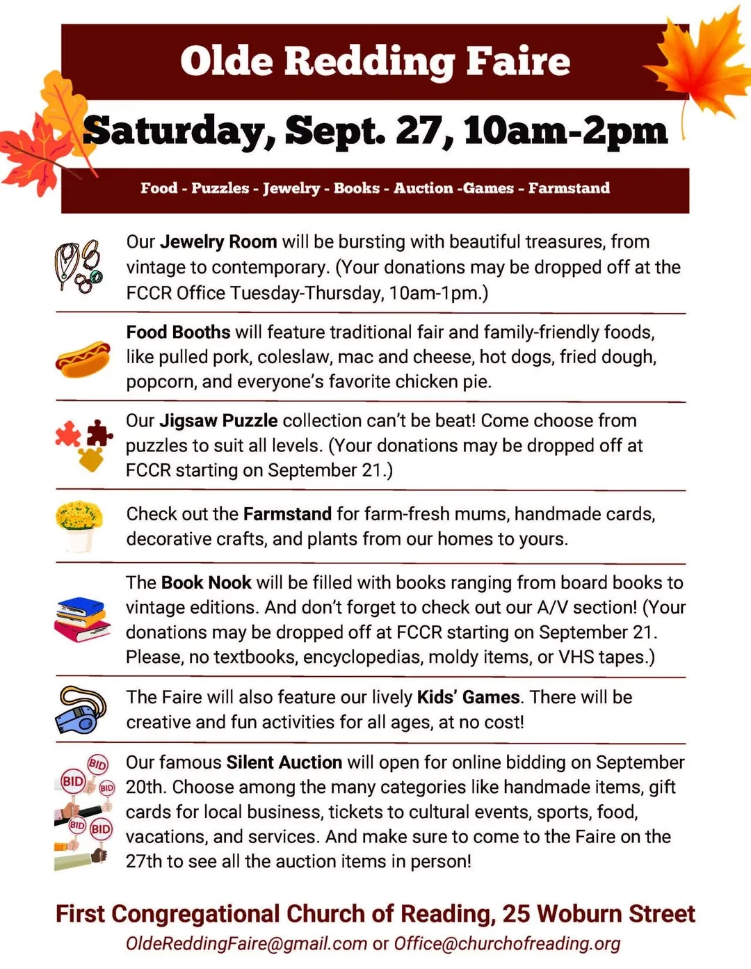 Since 1957, the Faire has been a special way to welcome the Fall season in the company of your friends and neighbors. Enjoy cider and donuts; play games, shop for bargains in Jewelry, Puzzles, and Books; purchase tasty baked goods and fudge; have a yummy lunch; shop seasonal items; place bids on our amazing selection of Silent Auction items.