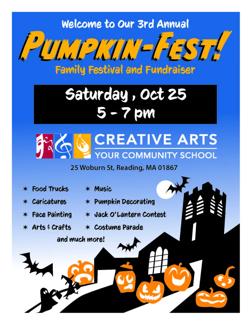 Creative Arts is celebrating its 3rd Annual PumpkinFest Family Festival and Fundraiser on Saturday, October 25, 2025, at 5:00-7:00 pm at Creative Arts, 25 Woburn Street in Reading. Pumpkinfest is free and open to the public regardless of the weather. All are welcome!