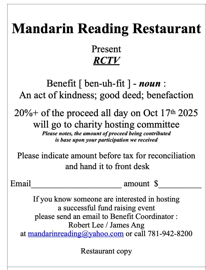 Recapping Everything in Reading, MA > News > Economy > Business > Shop 01867 > 🥡 RCTV Fundraiser Today at Mandarin