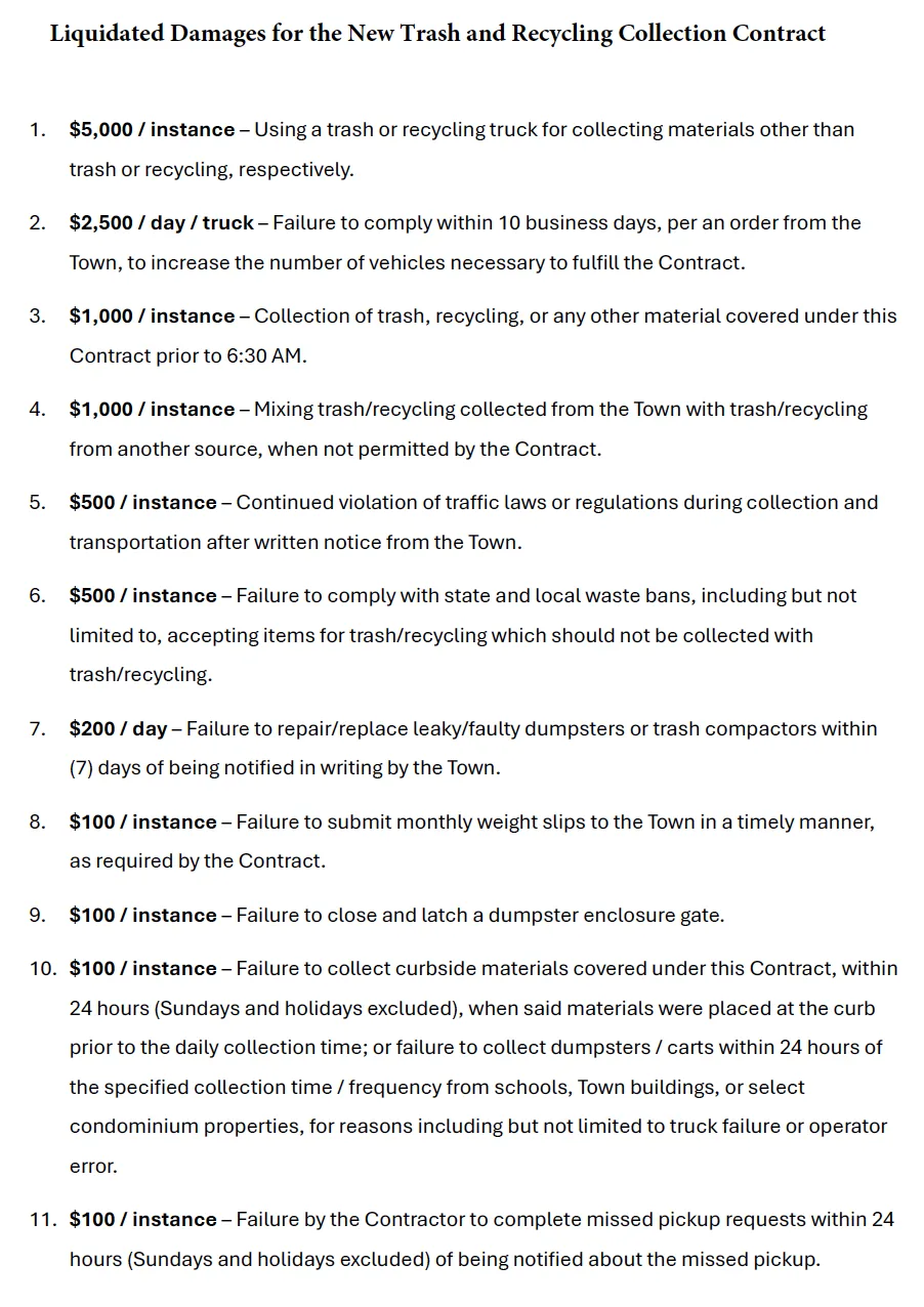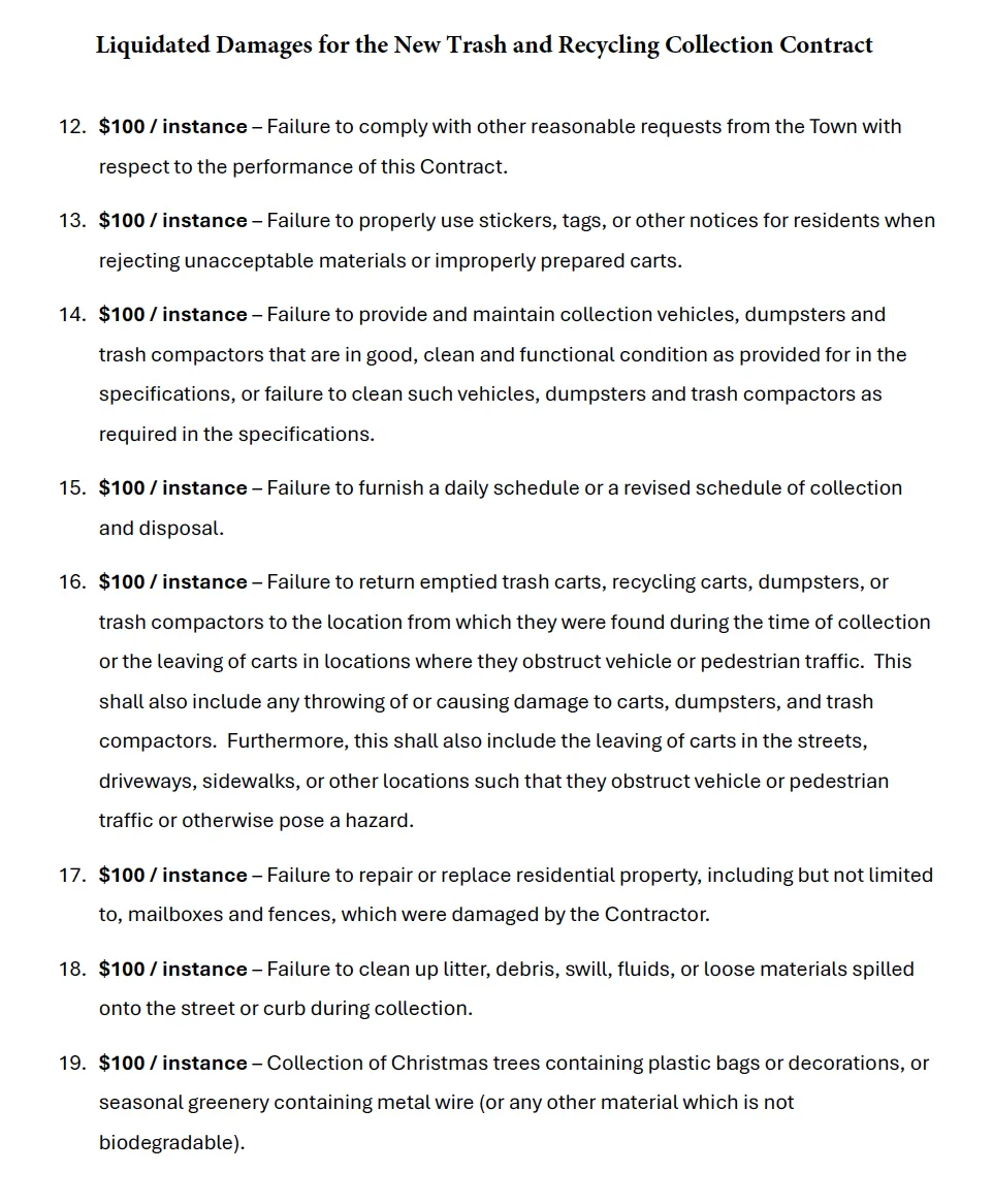 Republic Services representatives acknowledged past service issues but emphasized improvements in operations and customer service. They committed to using newer, more efficient trucks and agreed to match Waste Management’s lower pricing for burnable bulk and small metal items. The contract also includes 19 new penalty clauses including missed pickups (after 24hrs), adding accountability.