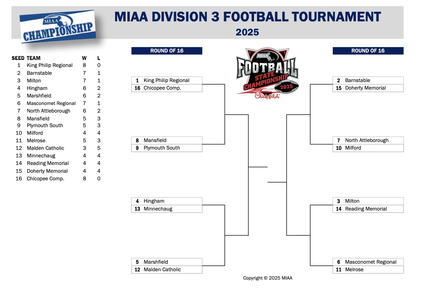 The Massachusetts Interscholastic Athletic Association (MIAA) announced the full Division 3 bracket on Sunday, November 2nd at 1pm, following the conclusion of the regular season. The Rockets will face off against #3 seed Milton, who finished the season with an impressive 7-1 record.