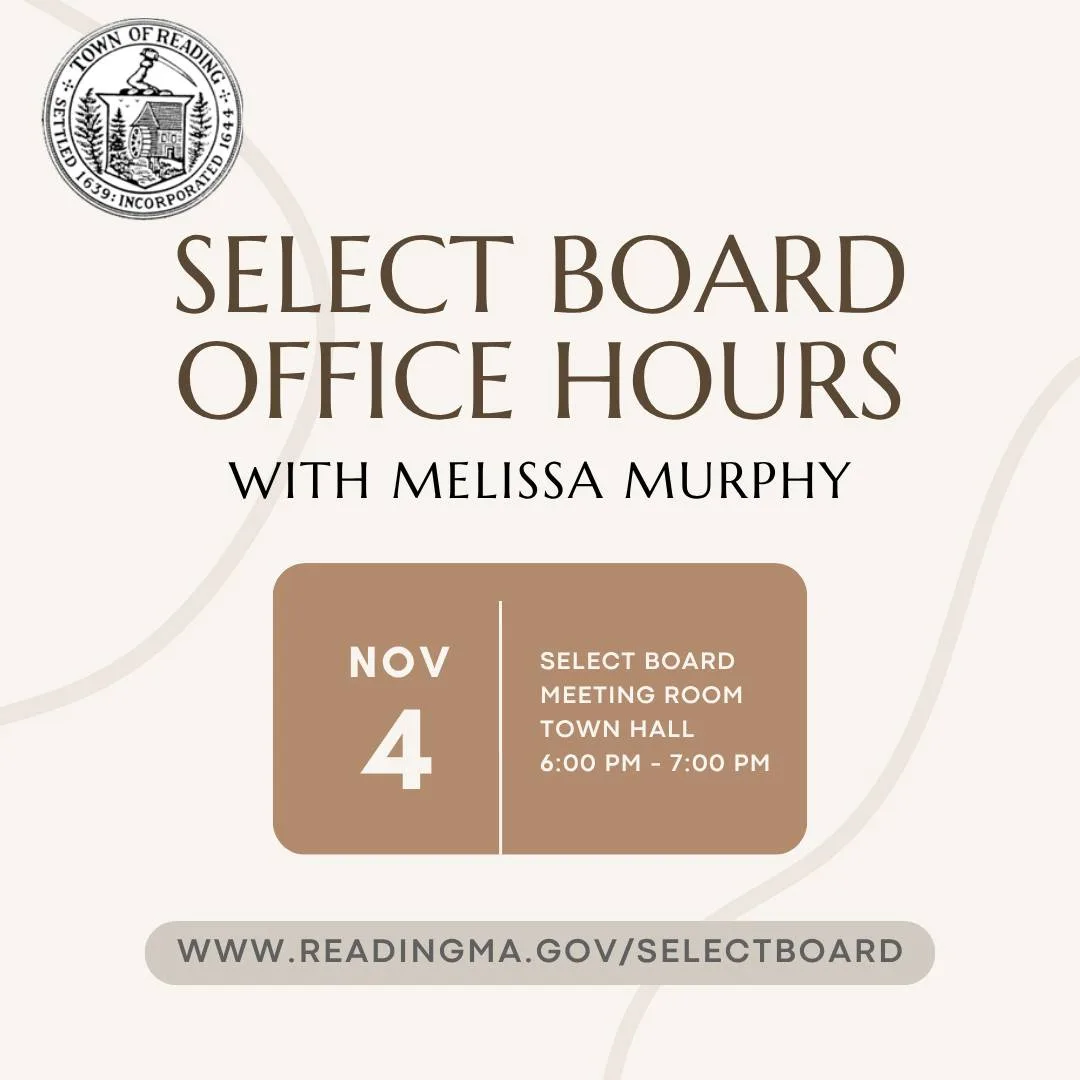 Join Select Board Member Melissa Murphy at her office hours on Tuesday November 4 in the Town Hall Select Board Room from 6:00PM-7:00PM. Come by to ask questions, share your thoughts, or just say hello!