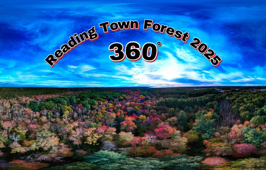 Every Thursday (when we remember), we post a different 360ยฐ aerial drone view of an area in Reading. If you are on a computer, you can use your mouse to look around and zoom in an out as well as rotate the picture below in any direction. On a mobile device or iPad, you simply pinch and zoom with your finger. This particular one below of the Town Forest was taken in October during peak foliage season.