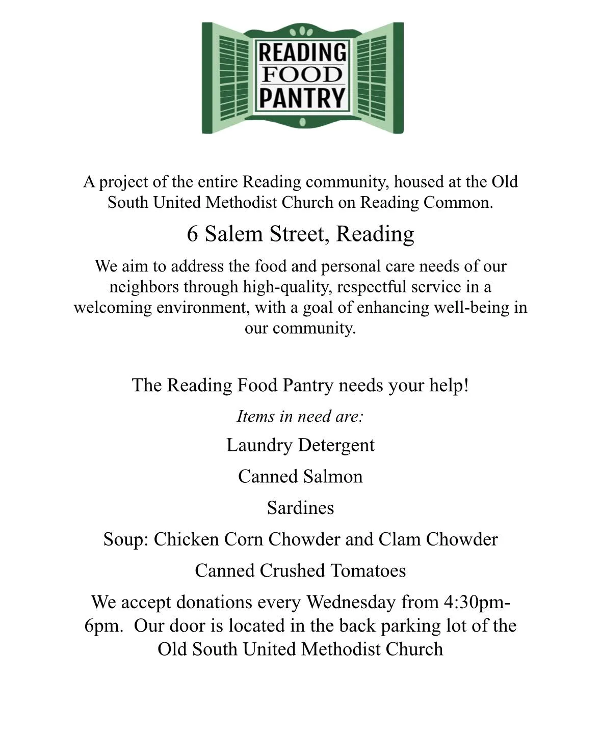 The Reading Food Pantry could use your help! Either with the list of items below or via direct donation. You can donate via PayPal using this link or you can mail checks made out to Reading Food Pantry to 6 Salem Street Reading, MA 01867. All donations are tax deductible.