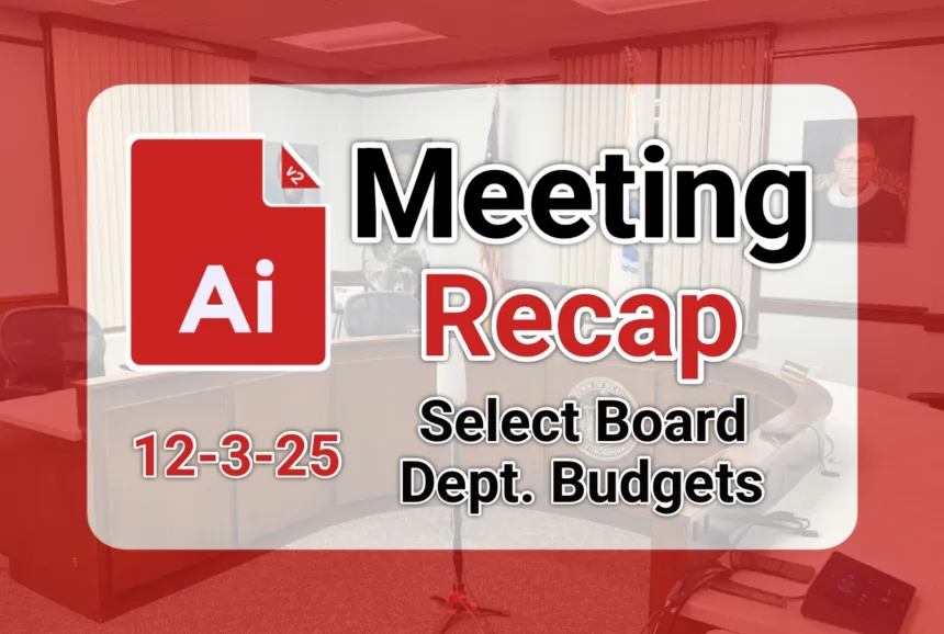 📋 Summary: The Select Board held budget presentations for FY27 from the Police Department, Fire Department, Health Department, Technology Department, and Department of Public Works, focusing on staffing, operational costs, community programs, and strategies to manage rising expenses.