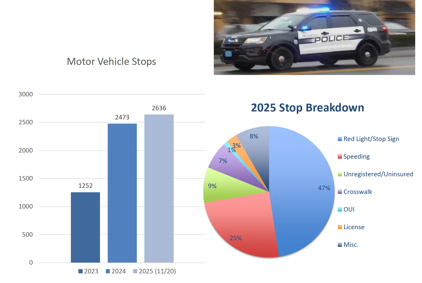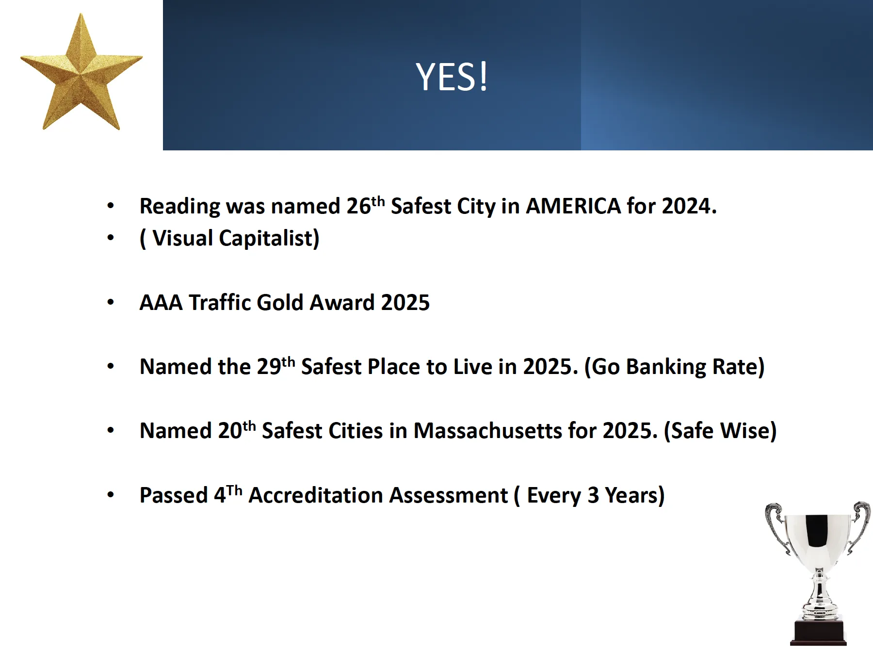 Amendola began by highlighting the department’s achievements over the past year. Reading remains fully staffed with 46 sworn officers—a rarity in Massachusetts—and continues to rank among the safest communities in the state and the nation. The town earned recognition as one of the top 20 safest municipalities in Massachusetts and received the AAA Gold Award for traffic safety initiatives.