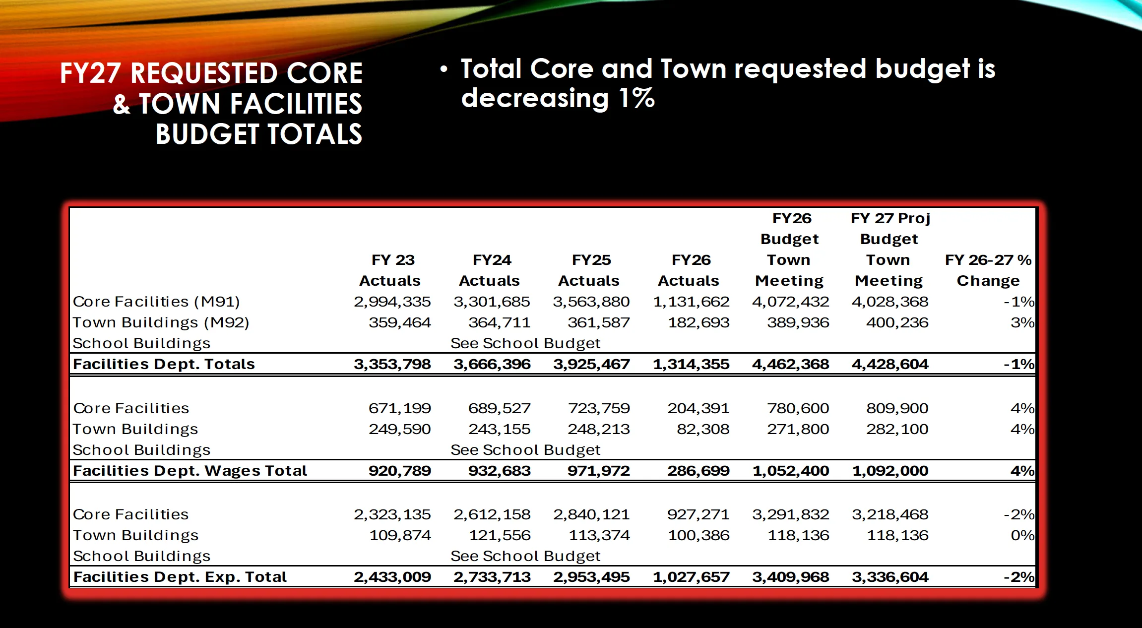 The town facilities budget, which covers custodial wages and outsourced cleaning, will increase by about 3%, driven by contractual wage adjustments. Supplies and service contracts remain level-funded.