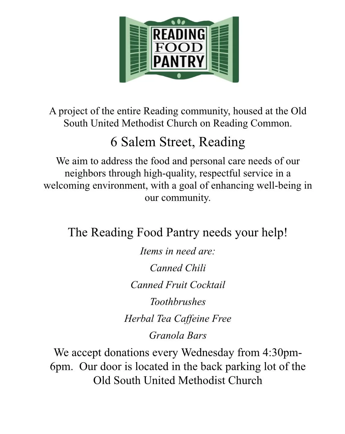 The Reading Food Pantry could use your help! Either with the list of items below or via direct donation. You can donate via PayPal using this link or you can mail checks made out to Reading Food Pantry to 6 Salem Street Reading, MA 01867. All donations are tax deductible.