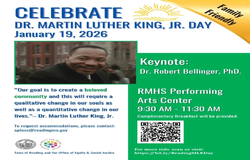 You are warmly invited to gather at the RMHS Performing Arts Center for Reading’s annual program honoring the life and actions of Dr. Martin Luther King Jr. Enjoy a complimentary breakfast provided by the Reading Public Schools, view student artwork, and visit tables hosted by local community groups.