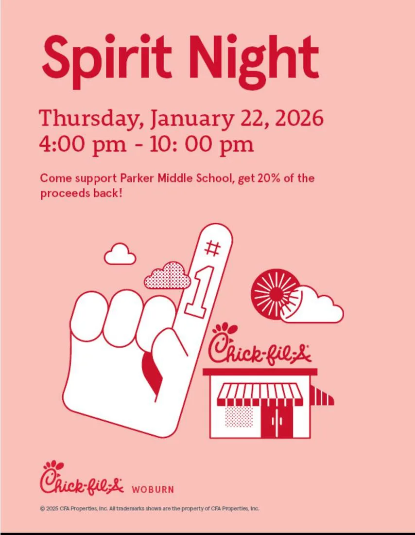 Help support the Parker Middle School today January 22, 2026 from 4:00 – 10:00pm. Chick-fil-A at 375 Washington Street, Woburn will donate 20% of sales if you show or mention the flyer (Parker) below, referencing the Spirit Night fundraiser. Stop on by and get dinner tonight and help support the Parker Middle School PTO in the process.