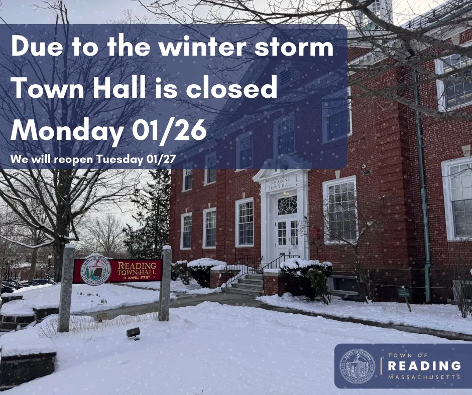 Due to the winter storm, Reading Public Schools, Reading Town Hall, the Reading Public Library and the Pleasant Street Center are closed all day Monday January 26.
