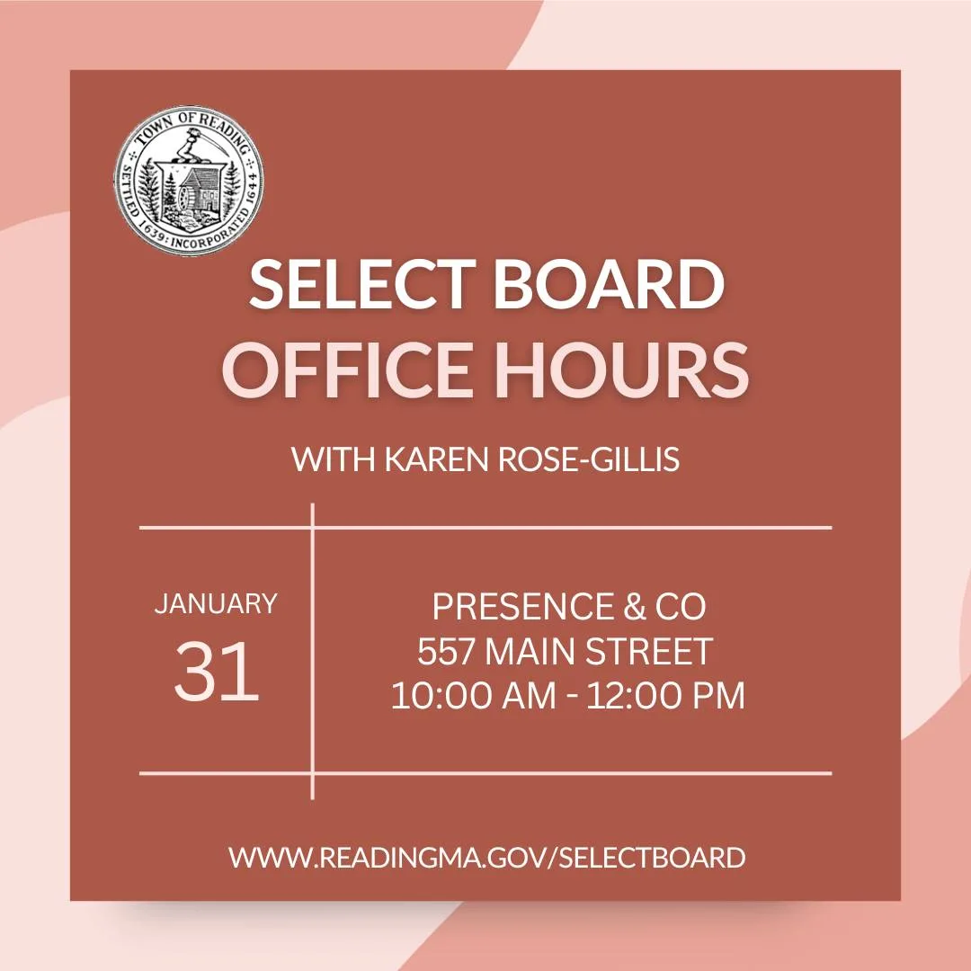 Select Board Member Karen Rose-Gillis will host office hours this Saturday January 31 at Presence & Co. at 557 Main St. from 10:00AM to 12:00PM