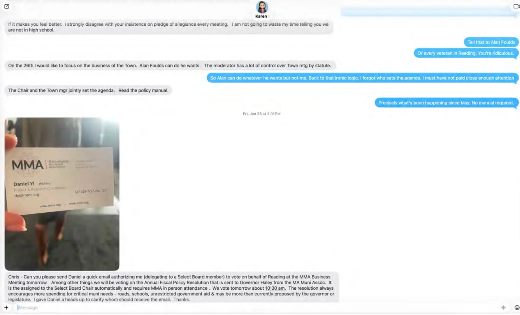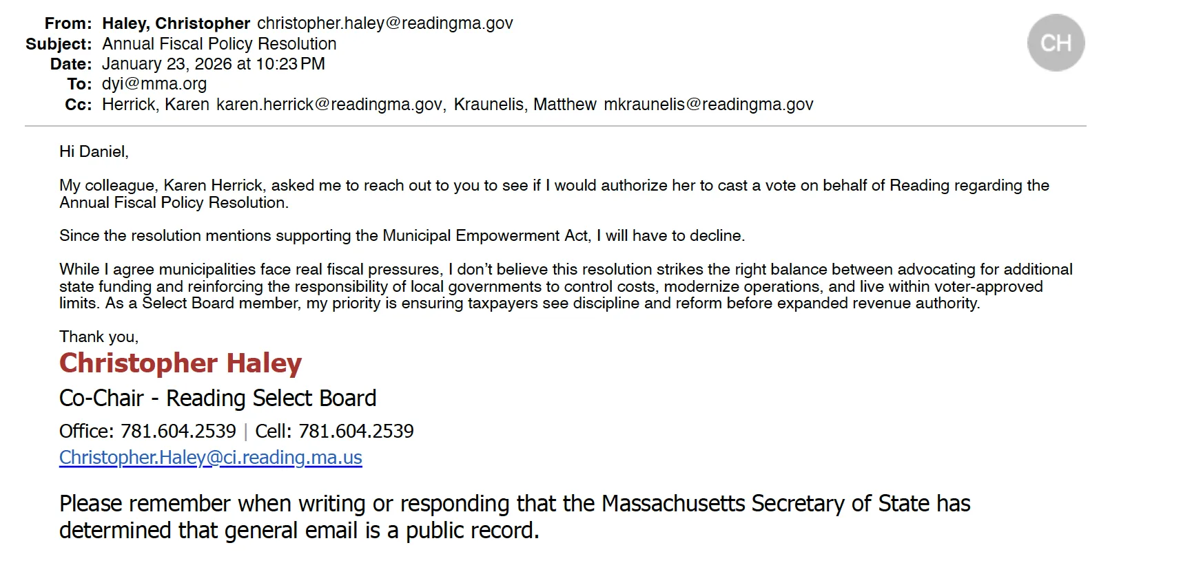 Communications in the Feb. 10 packet show the sequence: The day before the meeting, on January 23, Gately-Herrick sought authorization from Chair Haley to vote as Readingโs representative, providing the MMA link and the staff contact person. Haley reviewed the resolution and declined, citing opposition to aspects including the Municipal Empowerment Act and stating he wanted no involvement. Gately-Herrick indicated she would support the resolution as a Fiscal Policy Committee member. The next day she voted at the MMA business meeting for Readingโdespite an email from the chair explicitly stating she was not authorized to do so.