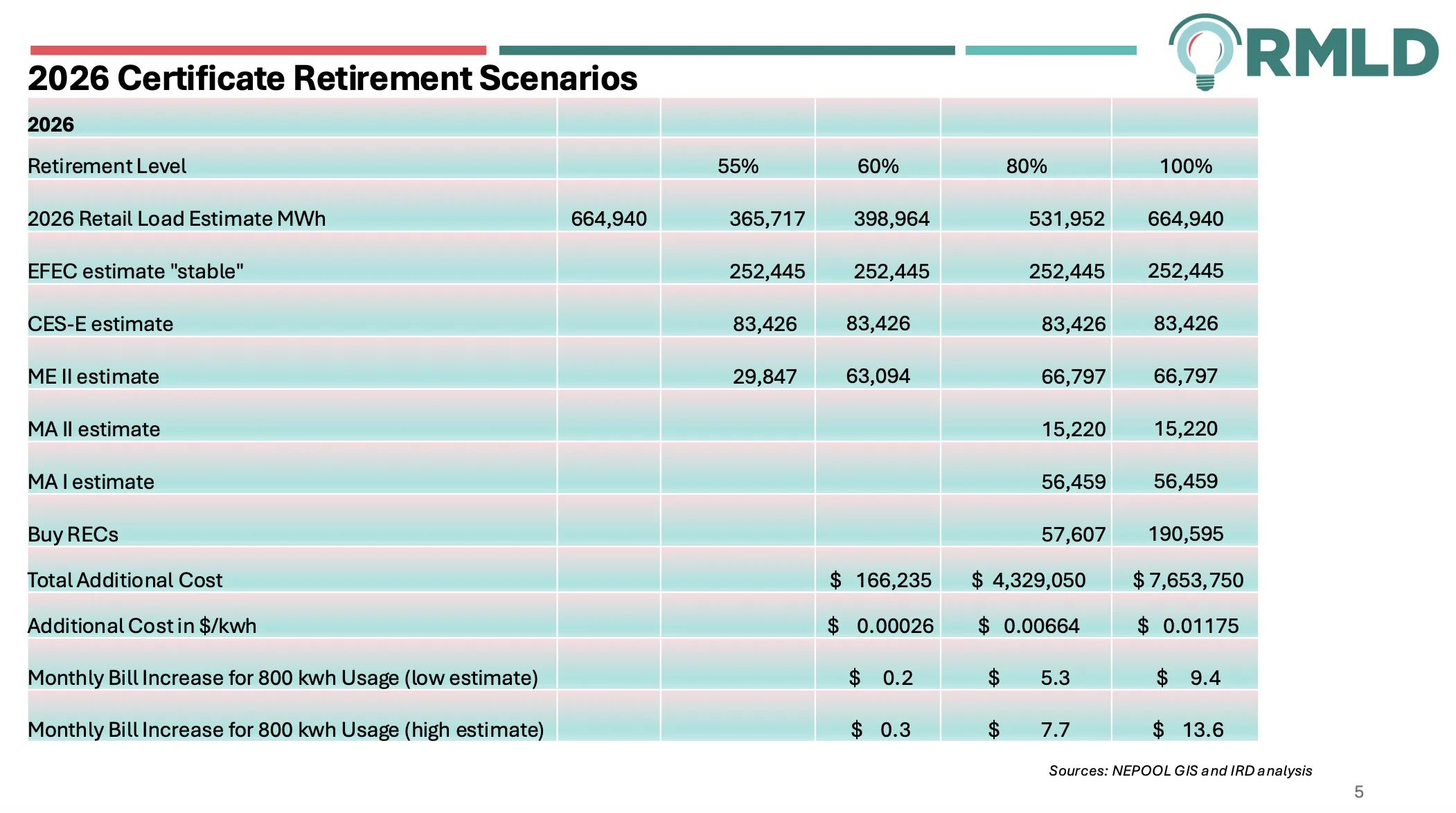 During the presentation, Oliver outlined comparisons between estimated and actual costs associated with higher REC retirement percentages, noting that most customers were projected to see bill increases of less than $2 per month under current scenarios. The analysis also highlighted uncertainties tied to load growth, variability in renewable generation, and exposure to fluctuations in the REC market, all of which could affect long-term costs.