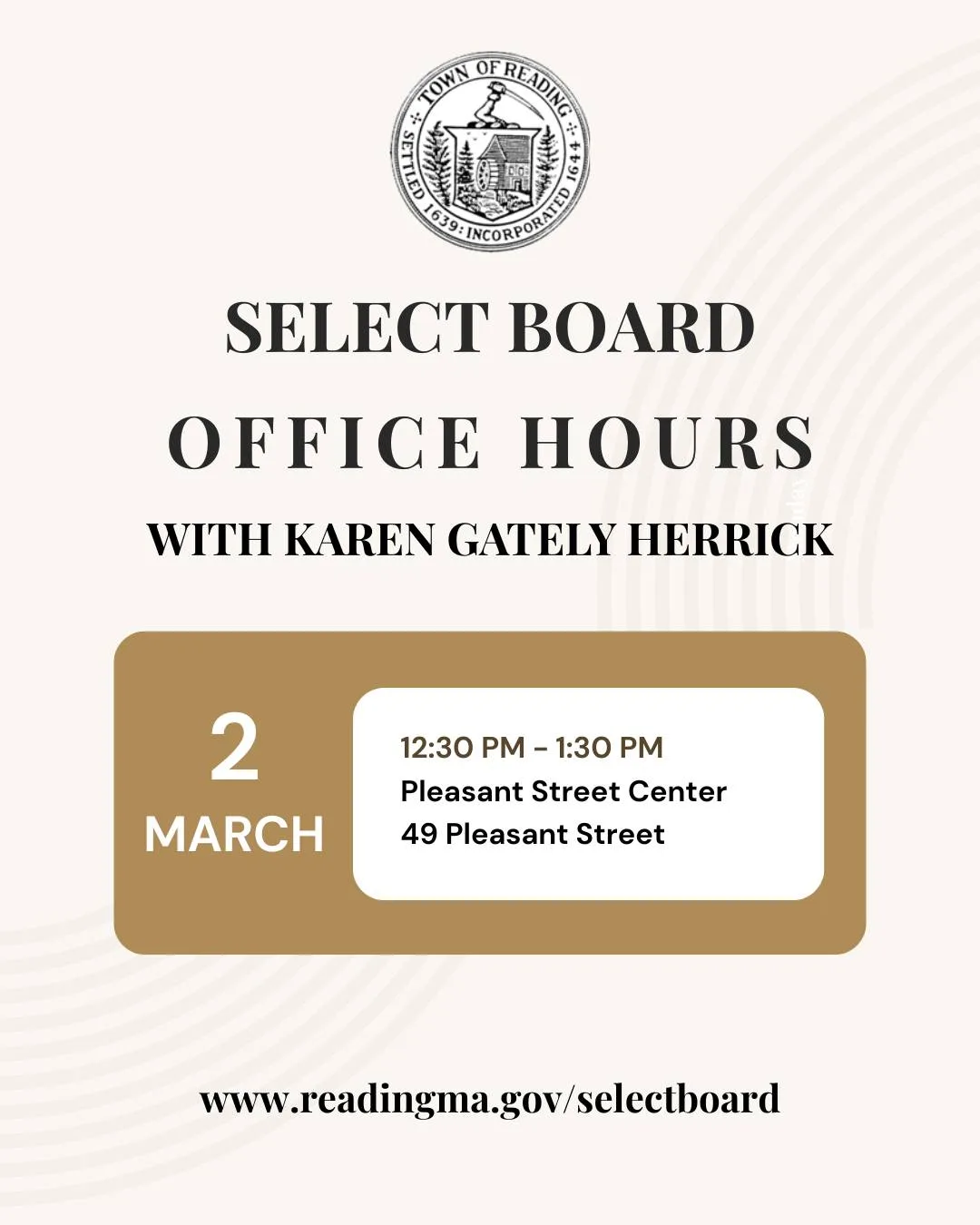 Connect with Select Board Member Karen Gately-Herrick during her office hours on Monday, March 2nd. She will be at the Pleasant Street Center from 12:30 PM to 1:30 PM to answer questions, hear your feedback, or simply chat.