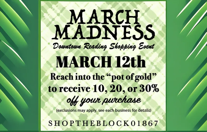 Downtown Reading is set to host its popular March Madness shopping event on Thursday, March 12th, brought to you by the local business community and promoted through @shoptheblock01867. For one day only, participating stores will invite shoppers to reach into a “pot of gold” at the register to reveal an instant discount of 10%, 20%, or 30% off their purchase. (Exclusions may apply—check with each individual business for details on eligible items.)
