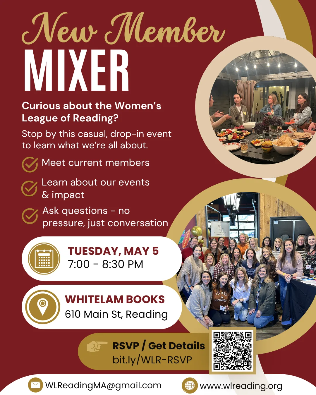 The Women’s League of Reading (WLR) invites community members to attend a New Member Mixer on Tuesday, May 5 from 7:00–8:30 PM at Whitelam Books. This casual, drop-in event is designed for anyone interested in learning more about the organization, meeting current members, and exploring opportunities to get involved.Â