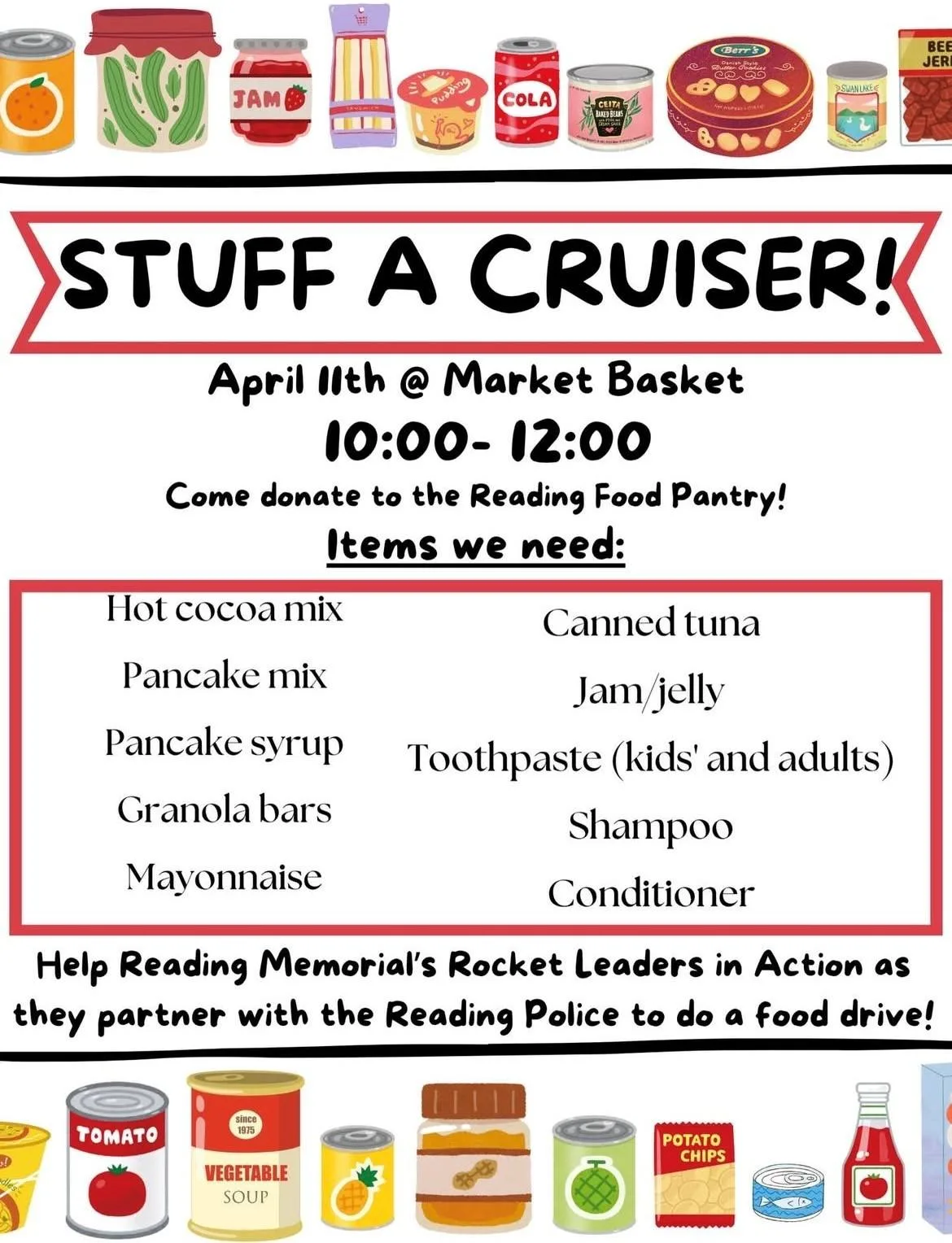 Today, April 11th from 10:00AM-12:00PM, there will be a Stuff-A-Cruiser Food drive at Market Basket 30 General Way in Reading. Donate today to support local families in need. All donations go to the Food Pantry.