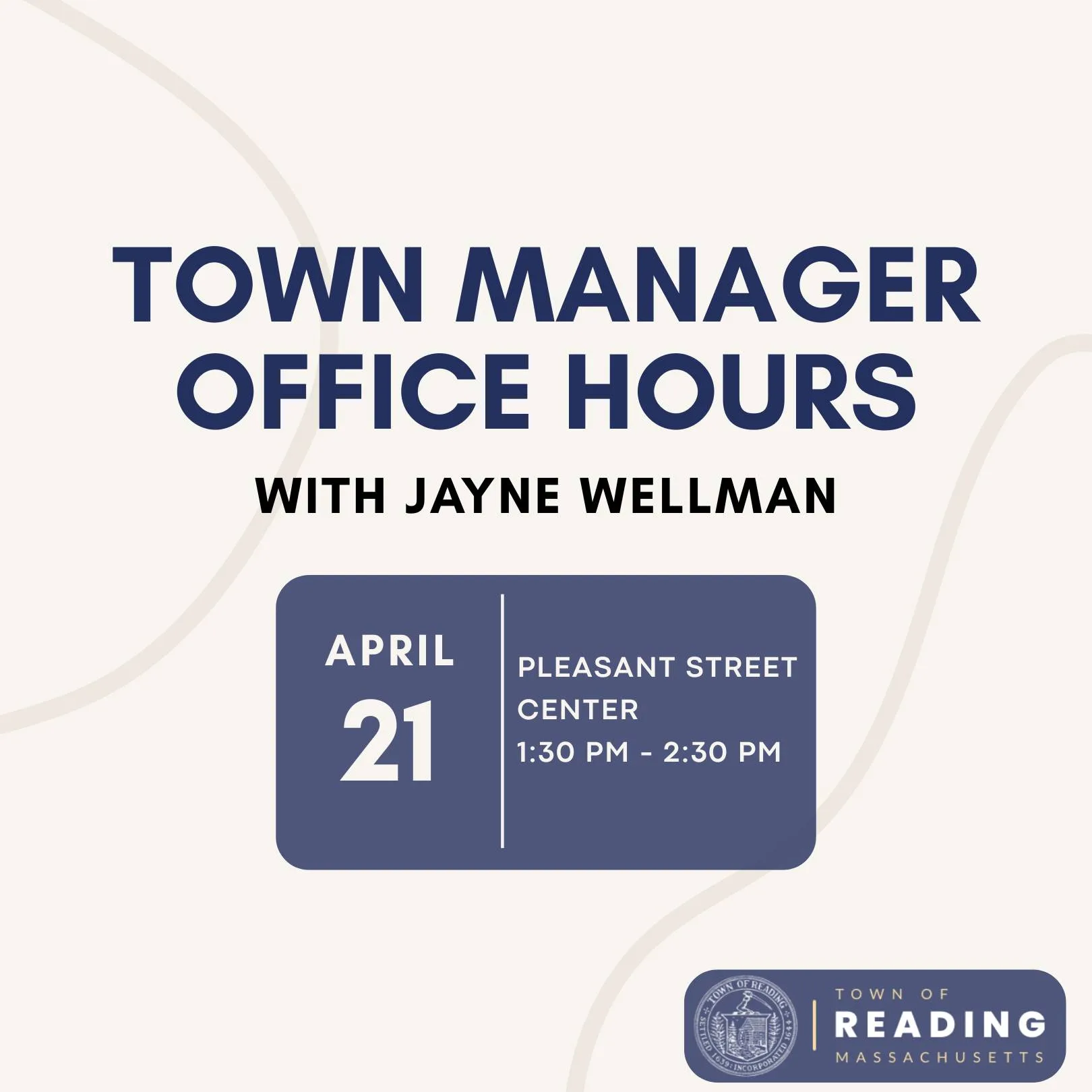 Join Town Manager Jayne Wellman for her office hours on Tuesday, April 21 at the Pleasant Street Center, 49 Pleasant Street from 1:30PM to 2:30PM.