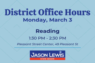 State Senator Jason Lewis will be having his district office hours today, Monday March 3rd. Jason will be available at the Pleasant Street Center located at 49 Pleasant Street, from…