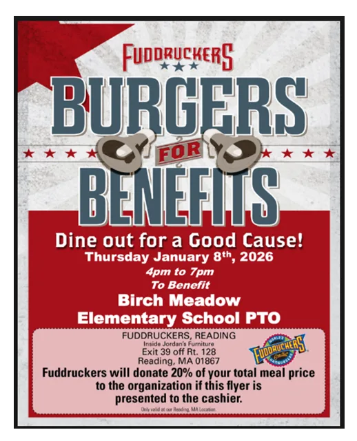 Rather not cook today? Grab dinner from Fuddruckers and support the Birch Meadow Elementary PTO! 20% of sales from 4-7pm will benefit the non-profit. Fuddruckers will donate 20% of your total meal price to the organization if this flyer below is presented to the cashier. Thank you!