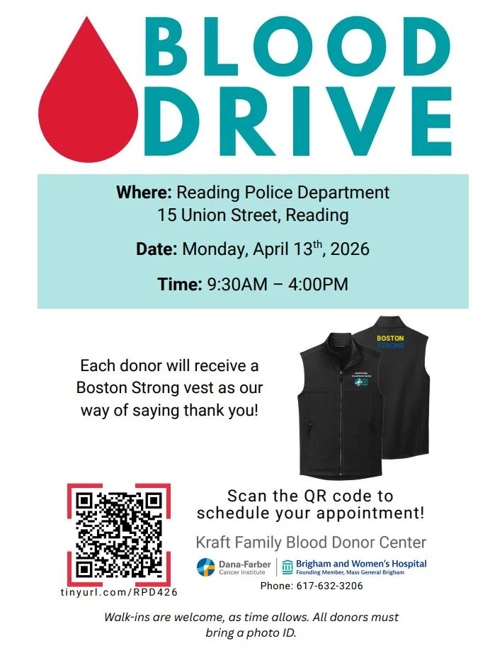 Join Us for a Blood Drive! 🚨 The Reading Police Department is proud to host the Kraft Family Blood Donor Center on Monday, April 13th! Your donation can help save […]