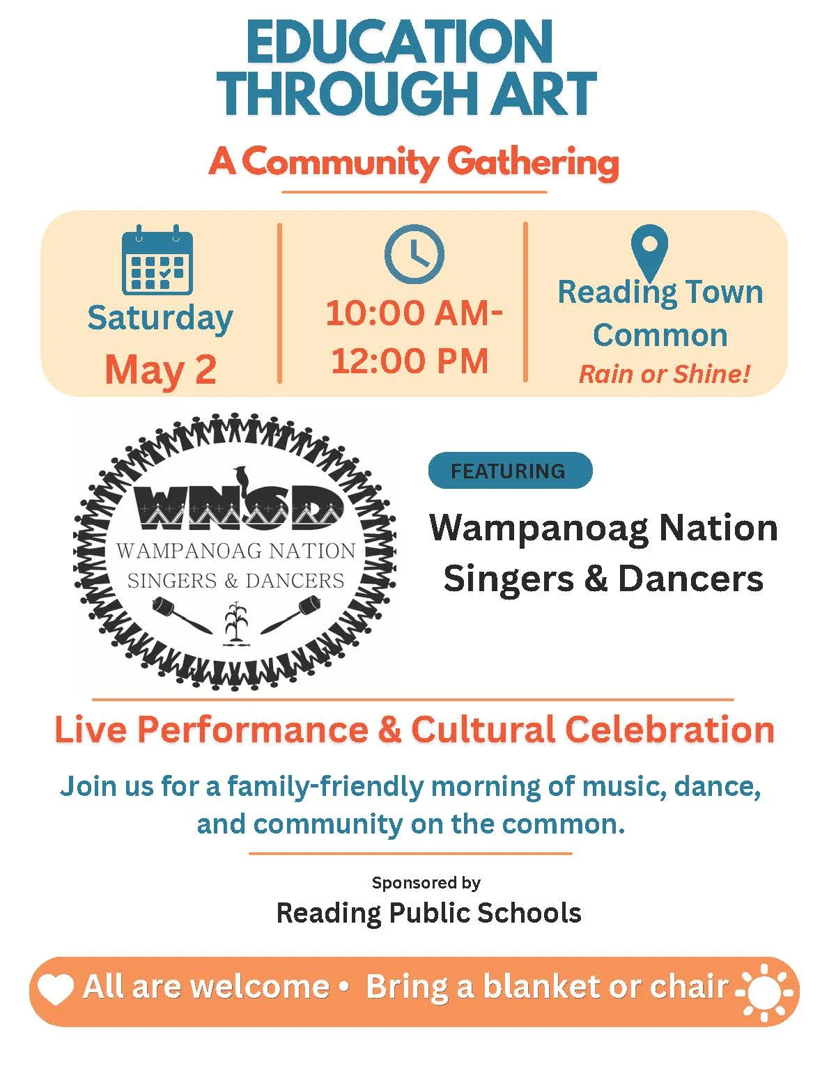 Reading Public Schools is honored to host the Wampanoag Nation Singers and Dancers for a special community-wide event.When: Saturday, May 2 at 10:00 AM Where: Reading Town Common This program […]