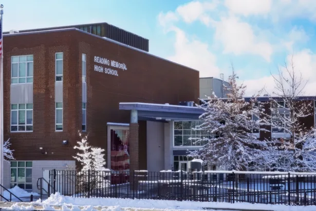 This morning around 6:30am, the Hawkes Field House rear wall near the parking lot at Reading Memorial High School, was…